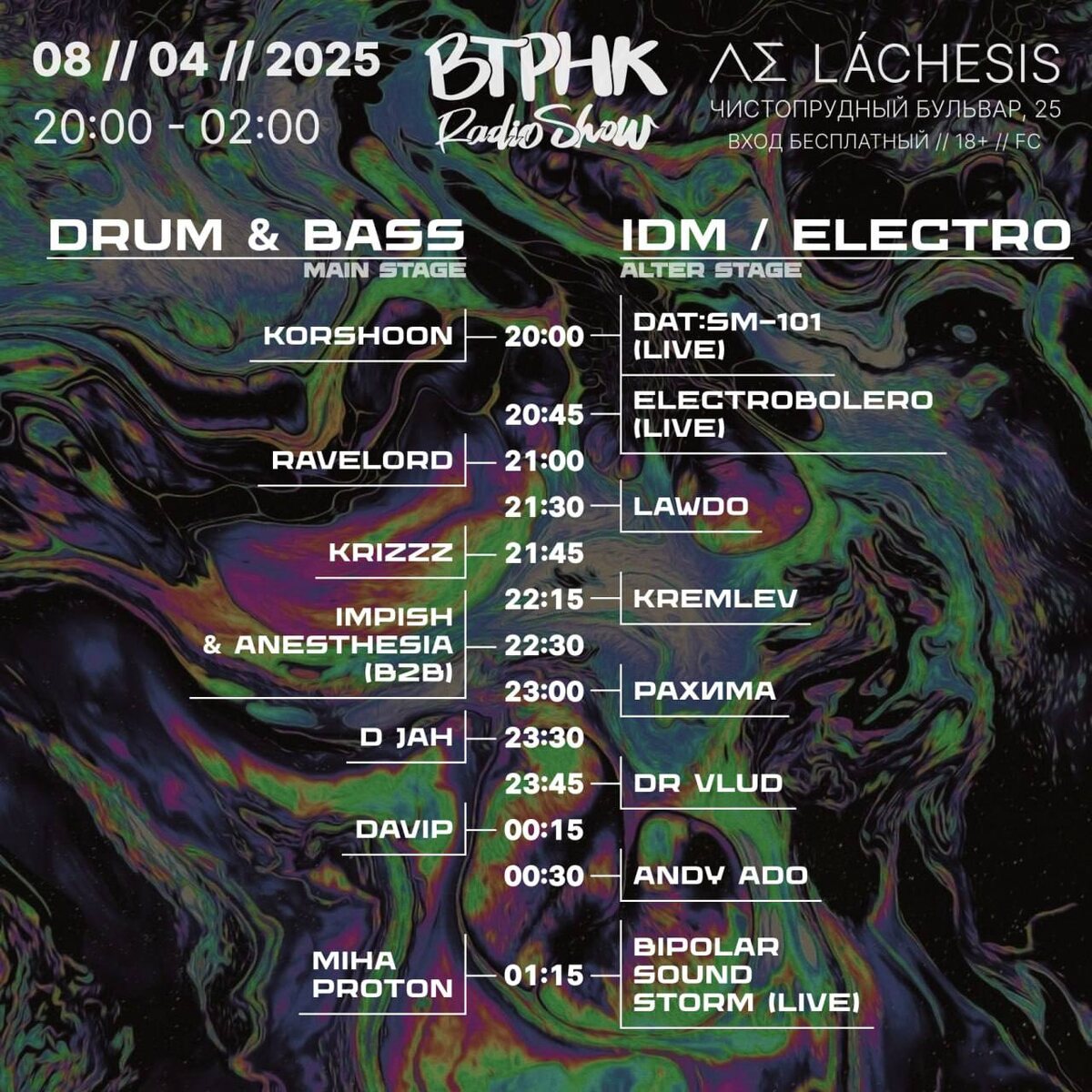Сегодня в клубе Лахесис сойдутся две мощнейшие команды школ ломанного звука. SUGAR BREAKS TIME с жарким и разрывным Drum & Bass захватит большой зал клуба 🔥, оттуда будет вестись трансляция нашего эфира ▶️ и шоукейс AIRCITY ENGINE с заряженным IDM Electro & Breakbeat ⚡️ который не оставит равнодушных настоящих ценителей качественной электроники. MAIN STAGE (live broadcast) 20:00 - 21:00 Korshoon (Министерство Ломанного Бита) 21:00 - 21:45 RaveLord (Paradox Team) 21:45 - 22:30 Krizzz 22:30 - 23:30 Impish & Anesthesia (b2b) (Berning Series) 23:30 - 00:15 D Jah (Sugar Breaks Time) 00:15 - 01:15 DaVIP 01:15 - 02:00 Miha Proton ALTER STAGE 20:00 - 20:45 DAT:SM-101 (live) 20:45 - 21:30 Electrobolero (live) 21:30 - 22:15 LawDo 22:15 - 23:00 KREMLEV 23:00 - 23:45 Рахима 23:45 - 00:30 DR VLUD 00:30 - 01:15 Andy ADO 01:15 - 02:00 Bipolar Sound Storm (live) 🔗 Основной стрим в VK, фото и видео с вечеринки 🔗 Стрим в Telegram и чат 🔗 Архив сэтов наших резидентов и друзей 🎫 Бесплатный вход F
