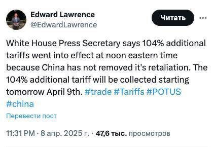 Белый Дом ввел 104% пошлин против Китая. 😭