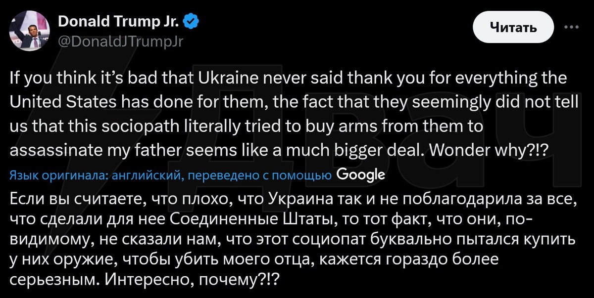 Если вы считаете, что плохо, что Украина так и не поблагодарила за всё, что сделали для неё США, то тот факт, что они, по-видимому, не сказали нам, что этот социопат буквально пытался купить у них оружие, чтобы убить моего отца, кажется гораздо более серьёзным. Интересно, почему?!?