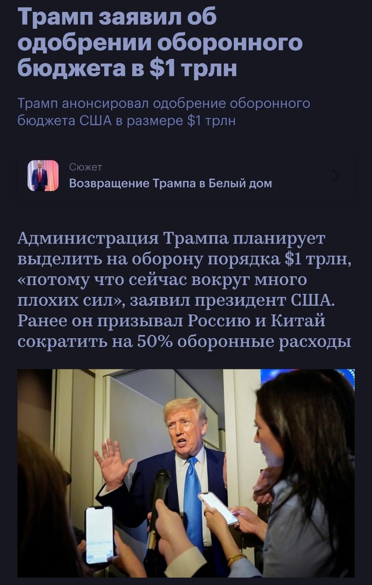 🤴 Трамп опять всех обманул. Вместо сокращения военного бюджета, подготовка к войне: бюджет Пентагона достиг рекорда в $1 трлн Дональд Трамп одобрил новый оборонный бюджет США в размере $1 трлн. По словам американского лидера, новый бюджет станет самым большим, который когда-либо принимали для армии. "Мы очень экономим деньги, но нам нужно строить армию и мы должны быть сильными, потому что сейчас вокруг много плохих сил (bad forces)", – заявил президент США. "Трамп восстанавливает наши вооружённые силы – и быстро. Мы намерены разумно потратить каждый доллар налогоплательщиков на летальное оружие и боеготовность", – подчеркнул глава Пентагона Пит Хегсет. Напомним, ранее в январе и феврале 2025 года Трамп обещал серьёзное сокращение военных расходов, и в публичных заявлениях говорил о демилитаризации США, а именно сокращении трат Пентагона сразу на 40%. Во что естественно поверила значительная часть российского общественного поля и госдедов, ведь если Трамп пообещал, то "так тому и