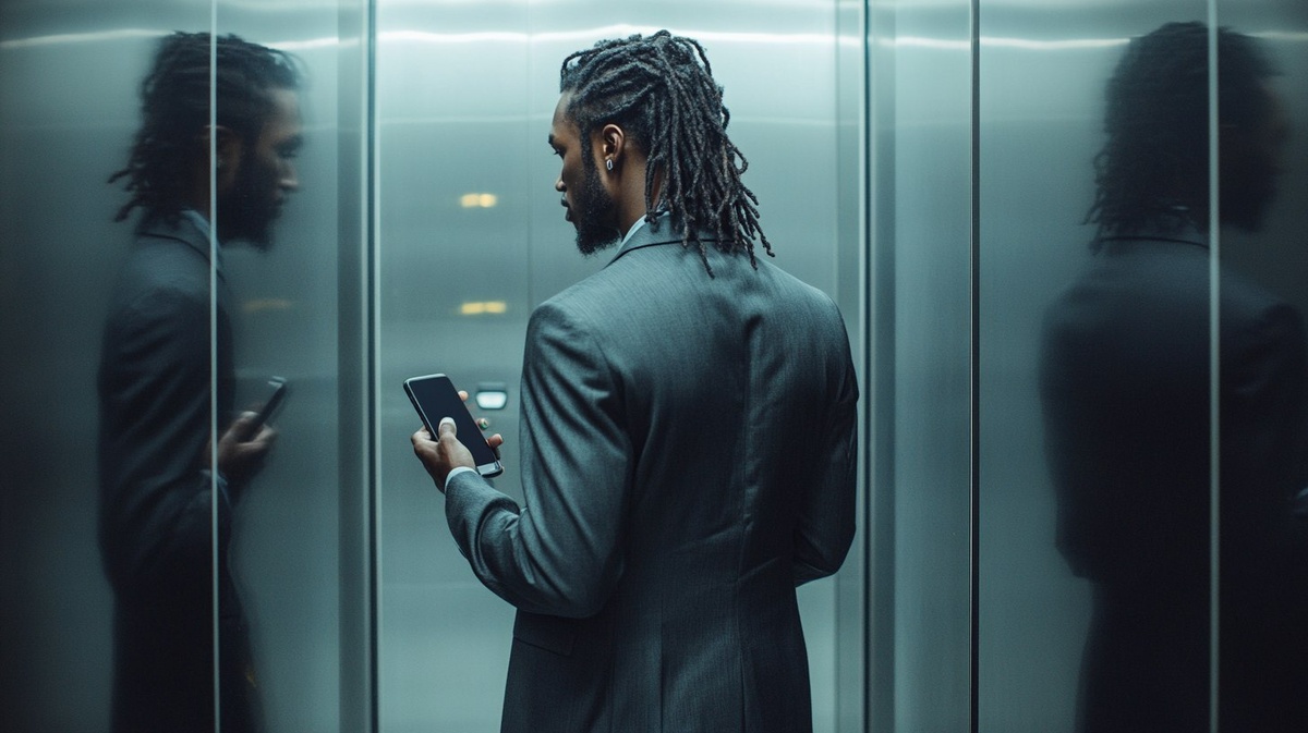 Создано на основе запроса: back angle, cool casual modern black male model, small tight braided dreadlocks, wearing grey urban fashion suit modern, casually standing not looking at phone, reflection in mirror hand by side holding his mobile phone in his hand by his side, standing in mirrored elevator, real photography --- Автоперевод: Бак -угол, прохладная повседневная современная черная мужская модель, маленькие плотные плетеное дреды, носящие серый городской модный костюм современный, небрежно, не смотрящий на телефон, отражение в зеркальном руке рядом, держа свой мобильный телефон в его руке, стоя в зеркальном лифте, настоящая фотография Хорошо выглядит? 🤔 https://dzen.ru/id/65c0c65c86e4f837c27b24d7 #ИИ #AI #нейросеть #midjourney #art