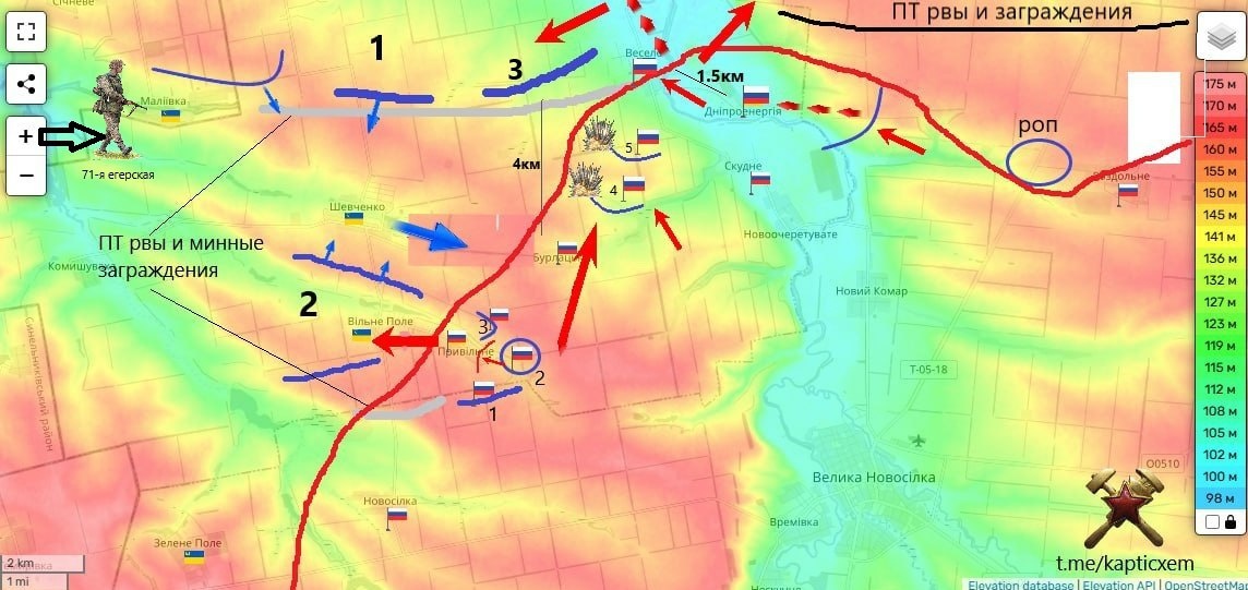 В ответ на пост Севернее Великой Новоселки. Вольное поле-Бурлацкое-Веселое 48-й штурмовой батальон ВСУ вывели отсюда и отправили сначала под Покровск, а далее куда то в тыл, по причине больших потерь, накопившейся усталости и внутренних дрязг. Даже пришлось командованию снять с должности их командира Ленура Ислямова. Важный кусок фронта постепенно начал проседать. Сильно потрепанная в сражении за Великую Новоселку 110-я механизированная бригада ВСУ сдавала опорник за опорником. И Генштаб противника перебрасывает со второй линии Покровского фронта 71-ю егерскую бригаду, заполняя многочисленные укрепления от Вольного поля и далее по фронту вокруг Шевченко, легкой пехотой. И попытаться блокировать наш набухающий бутон "Веселого цветка". схемы и карты