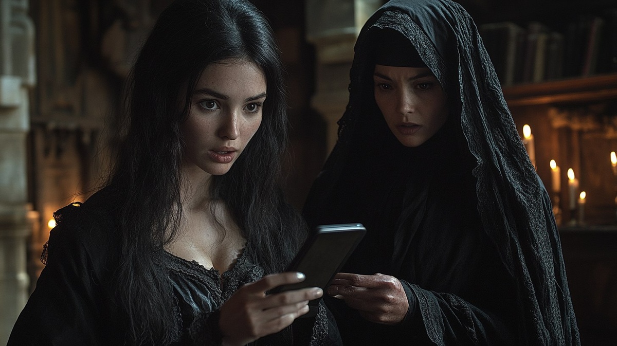 Создано на основе запроса: A young woman reluctantly hands her smartphone to a nun in a dark robe, the screen still glowing, candle-lit