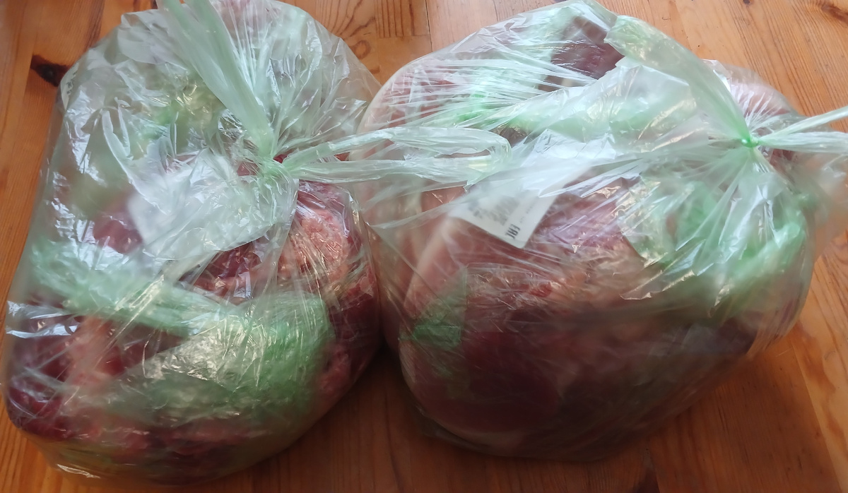 При ревизии запасов на апрель выяснилось, что запасы мяса у меня совсем скромные и на месяц на троих взрослых точно не хватит. Сразу было понятно, что нужно будет делать закупку мяса. Я планировала покупать мясо в Перекрестке - свинину и говядину. Купила в общей сложности чуть более 7 кг мяса. Тут у меня 1,5 кг грудинки, 2,4 кг свинины духовой, 1,3 кг окорока и 2 кг мякоти говядины, Всего 7,25 кг мяса на 3 290 руб грудинка и окорок по 350 руб говядина шея 750 руб свинина духовая 320 руб Грудинка сразу планировалась на запекание в фольге по типу буженины. Одну часть я запекла в тот же вечер. И еще две части натерла специями, завернула в фольгу и сделала полуфабрикаты. Потом при любом включении духовки для выпечки или приготовления ужина, такой полуфабрикат в фольге кладу в форму и запекаю. Утром будет вкусное мясо на бутерброды. По грудинке скажу так: если выбираете сами в магазине, то берем с минимальным количеством жира, запекаем и получаем отличный продукт на бутерброды. Если в д