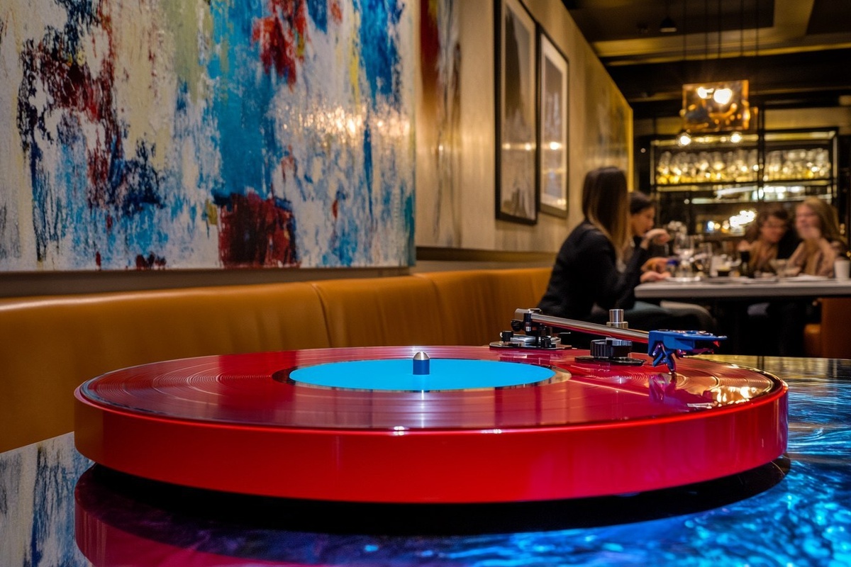 Создано на основе запроса: high-resolution photo of a red turntable with blue tonearm mounting hole, in a elegant lounge with post-surrealist paintings at the wall, smart casual dressed ladies sitting at the sofas,