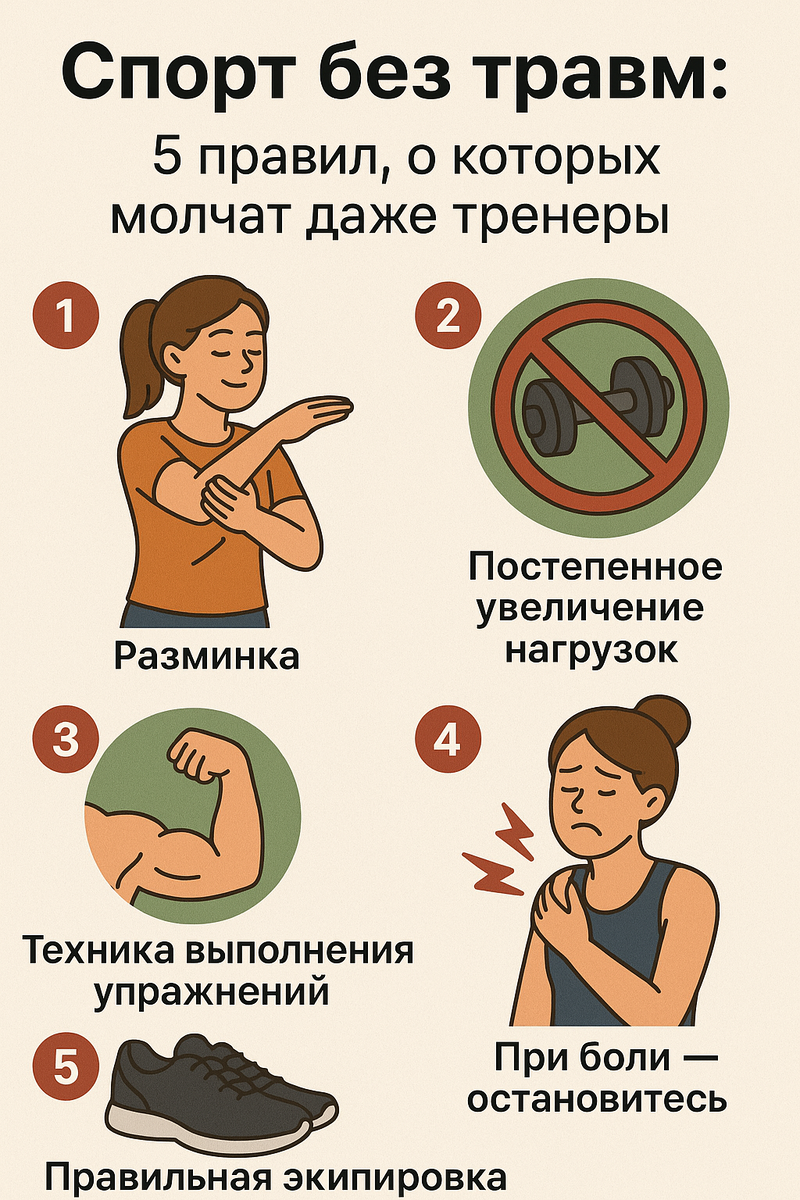 «Каждый второй посетитель зала хотя бы раз получал травму из-за ошибок в тренировках. Причем 70% этих травм можно было избежать! Профессиональные тренеры редко говорят о нюансах, которые спасают связки и суставы — ведь их клиенты платят за «результат любой ценой». Но вы не обязаны расплачиваться здоровьем за кубики пресса. Собрали правила, которые используют физиотерапевты и опытные атлеты, чтобы оставаться в строю даже после 40 лет». Почему это важно: Классическая суставная разминка не готовит мышцы к нагрузке. 📌 Пример: Тяжелоатлетка Лидия Валентин перед тренировкой 10 минут делает упражнения на мобильность голеностопа. Результат: ни одной травмы за 8 лет карьеры. Как распознать угрозу: 💡 История: Блогер Максим игнорировал ноющую боль в плече. Итог — разрыв вращательной манжеты и 6 месяцев без спорта. Правило «3 секунд»: 🔥 Лайфхак: Снимайте себя на видео и сравнивайте с техникой профи (например, Джефф Ниппард на YouTube). Что убивает ваши результаты: 📊 Данные: Исследова