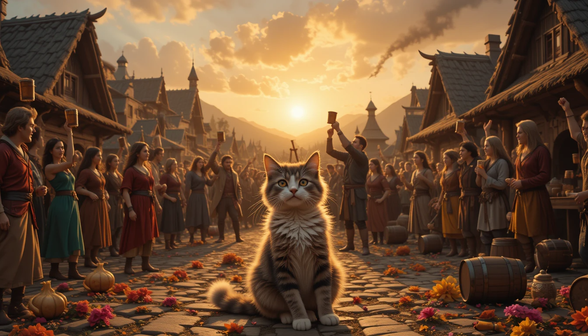 Праздник в Песнецвете и кот на пьедестале (черновик) Громозуб улетел, оставив за собой золотое перо и тишину — не злую, а добрую, что приходит после долгого дня. Деревня Песнецвет ожила — солнце выглянуло из-за гор, ветер зашуршал в листьях, а ручьи зазвенели, будто подпевали. На площади собрались все: старухи с ложками, дети с дудками, мужики с кружками эля. Товиас, Лира и Мурзик стояли в центре, флейта из Звонкого Древа блестела в руках мастера, а золотое перо лежало на столе, как трофей. — Ну что, прогнали ящера! — крикнул кто-то из толпы. — Песней, а не мечами! Старуха соседка потрясла ложкой: — Я ж говорила — шумом его не взять, а вы мелодией справились! Товиас поднял флейту, улыбнулся: — Не шумом, а ладом. Вместе спели — я, Лира и котяра наш. Мурзик вылез вперёд, шерсть дыбом от гордости: — Котяра? Я драконоборец, между прочим! Этот ящер мне перо оставил, а не вам! Лира засмеялась, ткнула кота в бок: — Перо нам всем, Мурзик. Ты мурлыкал, я пела, дед играл — вместе мелодию сложили