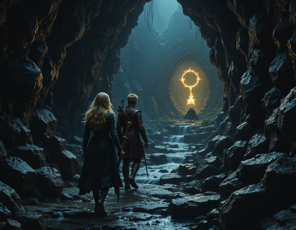 Тихий проход и шёпот в темноте Элара, Финн и Рин крались по тёмному проходу меж Чёрных Скал, где стены блестели, как мокрый уголь, а воздух пах сыростью и чем-то кислым, будто тролль тут суп варил. Посох в руках Элары светился еле-еле, словно боялся выдать их, и тыкался вперёд, дрожа, как лист на ветру. Траг остался позади — его вопли про "тупых лягушек" затихали, заглушённые кваканьем да шорохом леса. — Тихо идём, — шепнула Элара, оглядываясь. — Лесовик сказал, Вейра голоса слышит. Финн кивнул, прижав палец к губам, но меч за спиной звякнул шепотом: — Хозяин, дай бой! — Тсс! — шикнул Финн так яростно, что чуть не плюнул. — Замолчи, железка, или Вейра нас найдёт! Лягушка на его плече квакнула тихо: "Квак…" — будто тоже шикала на меч. Финн покосился на неё: — И ты туда же? Сиди смирно, зелёная. Рин шёл впереди, ступая мягко, как лис, и шепнул: — Чую запах — старушечий, с примесью цветов. Вейра близко, и зеркало её тоже. Только бы штаны не треснули, а то шум будет. Элара хмыкнула, но тут