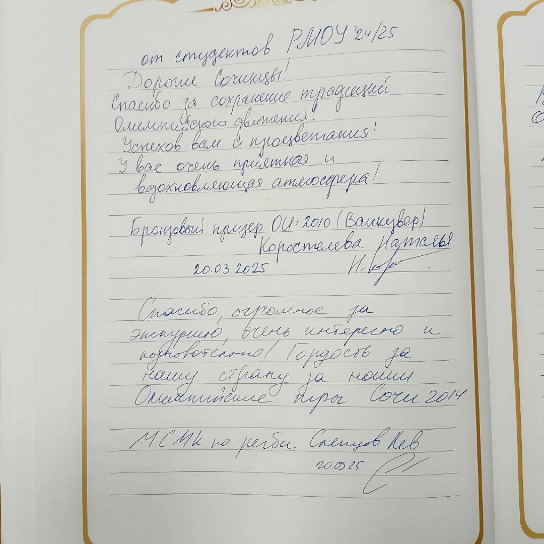 Недавно в музее спортивной славы Сочи прошла необычная встреча. Студенты РМОУ — и по совместительству титулованные спортсмены — заглянули на экскурсию, пообщались с гостями и удивили своими историями. В музее собрались: • Наталья Коростелева — бронзовый призер Олимпиады в Ванкувере, лыжница, заслуженный мастер спорта. • Лев Слепцов — трехкратный чемпион России по регби-7, мастер спорта международного класса. • Ольга Шуйская (Зайкова) — президент Федерации айкидо Москвы и Московской области, мастер боевых искусств России, обладательница 5 дана. Они посмотрели экспонаты, поделились опытом, рассказали о своих победах и о том, как учатся в РМОУ. Больше всего гостей удивила история Натальи Коростелевой — бронзового призера Олимпиады в Ванкувере. Она и ее брат Николай Морилов взяли медали в один день с разницей всего в полчаса. Такого семейного дубля на Играх еще не было. Встреча прошла неформально, но с пользой: договорились о пополнении музейной коллекции и дальнейшем сотрудничестве. И сде