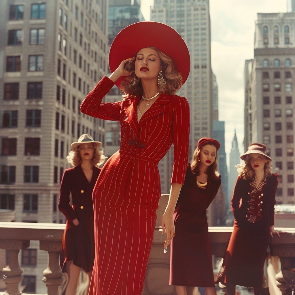 Создано на основе запроса: many female models, American female models, group of several American woman | 1940s NYC, art deco aesthetic | red