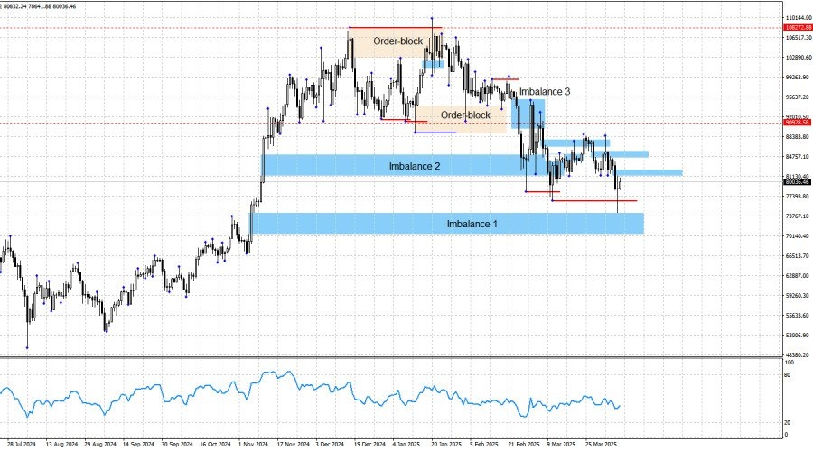 https://basechop.ru/wordpress/?p=37594 Добрый день, уважаемые трейдеры! Биткоин продолжает формирование нового «медвежьего» тренда. Структура остается «медвежьей», цена получила несколько реакций от ближайших «медвежьих» имбалансов, я ожидал падения, и оно произошло. Отработан «бычий» имбаланс (1), который я неоднократно называл целью падения. На мой взгляд, падение может не завершиться и на этом. В ближайшие несколько дней нужно понять, случится ли закрепление котировок биткоина под этой зоной. Если да, то падение приобретет еще более стремительный характер, но нельзя исключать и коррекционный откат. Биткоин упал примерно на 12000$ после того, как Дональд Трамп объявил о взаимных пошлинах для всех стран, и это очень позитивный знак. Он подтверждает правильность сделанных ранее выводов. Я не считаю, что самая «горячая фаза» торговой войны осталась теперь позади. Таким образом, биткоин может упасть гораздо ниже. Главной зоной интереса для продаж выступал «медвежий» имбаланс (3),…