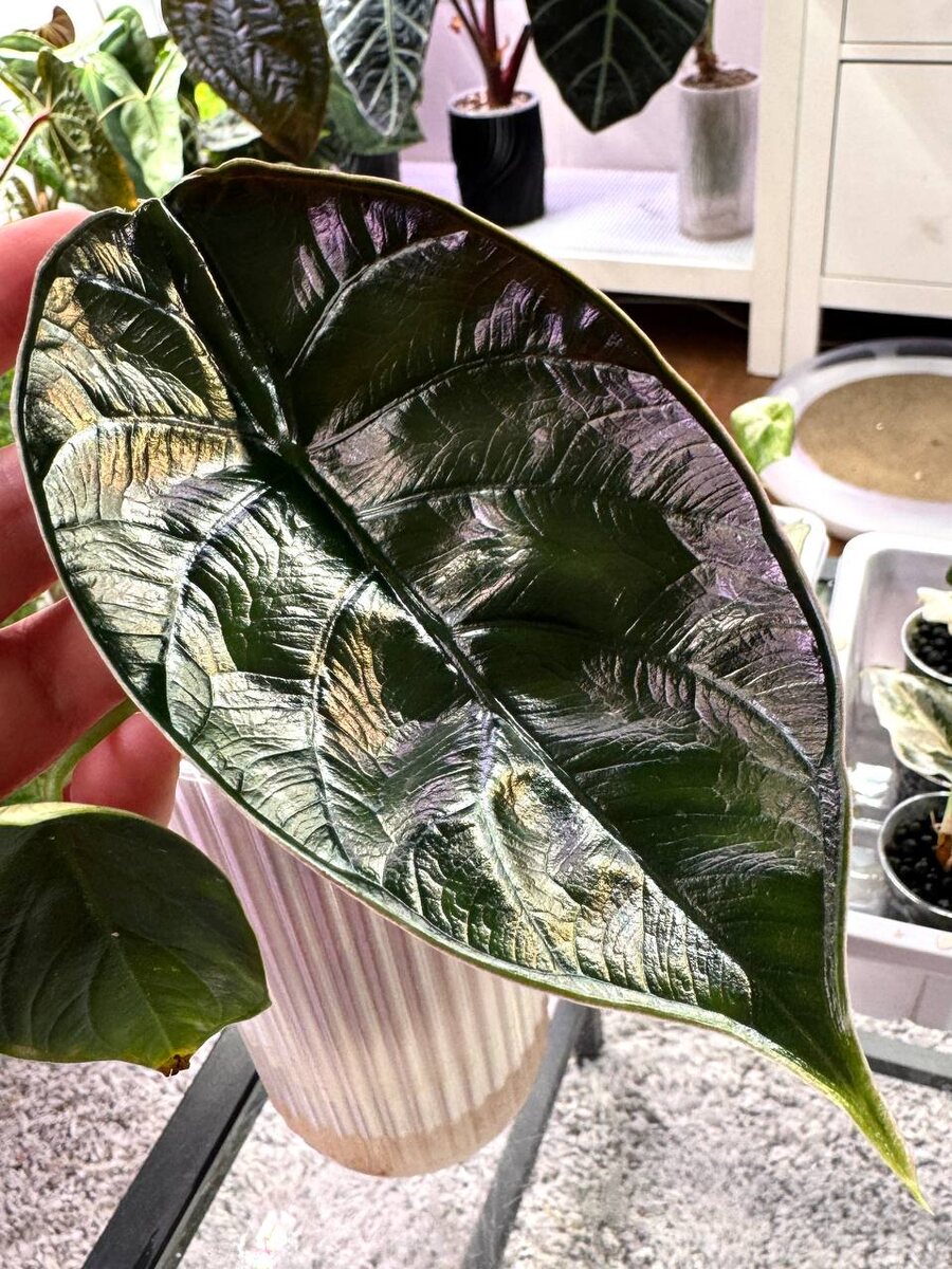 Green Unicorn. Интересный гибрид азлани и шкуры дракона. Это второй домашний лист, и вот наконец можно оценить его в полной мере - предыдущие листья не очень внятные и без бордовой изнанки. По скорости роста точно пошел в азлани, очень долго формирует и раскручивает новый лист. Особых капризов не замечено.