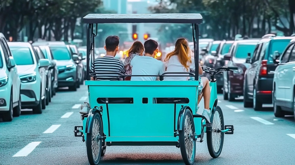 Создано на основе запроса: a family of four in a bike cab. there's a big traffic jam. they ride between cars. it is the magic hour of dusk. the four-bike is in the middle of a big traffic jam on a downtown street of a city. cinematographic photography, depth of field, realism. realistic photo. --- Автоперевод: Семья из четырех человек в велосипедной кабине. Хорошо вышло? 🤔 https://dzen.ru/id/65c0c65c86e4f837c27b24d7 #ИИ #AI #нейросеть #midjourney #art