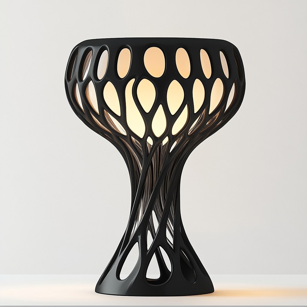 Создано на основе запроса: create me a black voronoi table lamp with round lines and a modern look on a white background in 8k realistic