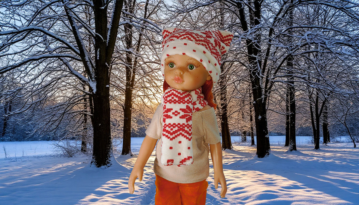 Сегодня публикуем новый мастер-класс из серии "Лыжный костюм": будем шить шапку и шарфик. Сначала хотели сделать как брюки или жилетка (рыжими) или кофточка (бежевыми), но потом передумали. Из ткани раскроим две детали: прямоугольники 36*9 см и 22*13 см. Если Вы взяли ткань как у нас с рисунком, то необходимо учитывать, как будет смотреться готовое изделие. Теперь приступим к изготовлению шапочки. Свернем ткань пополам как на рисунке ниже и соединим булавками или специальными прищепками-зажимами. Прошьем шов, отступив от края около 5 мм. Далее сделаем прошитый шов посередине сложенной детали (как на фото ниже), и прошьем, отступив 5 мм, сверху. Обметаем все швы, кроме оставшейся не прошитой стороны детали. Если у Вас ткань сыпется, то ее также необходимо обметать. Мы уголки немного, одним стежком, зашили посередине, чтобы более выражен был эффект "ушек кошки". Так любит дочка. Это можно не делать. Далее подворачиваем на 2 см (+ 5 мм на шов) и подшиваем потайным швом. Можно приклеить н