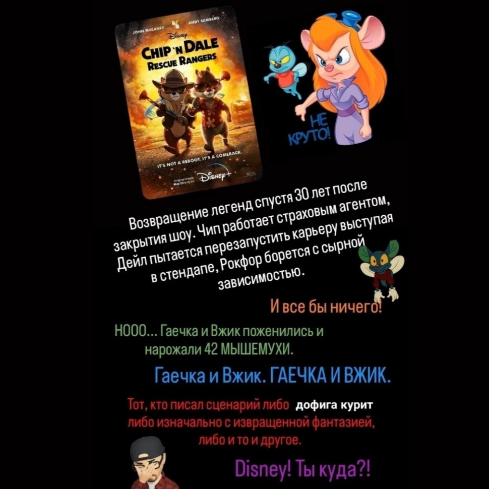 Я с детства фанат мультфильмов от студии Дисней. Как только появился "видак" наверное я пересмотрел все на тот момент вышедшие мультфильмы от "Меч в камне" до "Король Лев", разумеется весь Том и Джерри от MGM, ну и конечно не обходилось без воскресных утренних мультсериалов таких как "Черный Плащ", "Алладин" и "Чип и Дейл". На днях увидел уже не свежий фильм про спасателей. Признаться, был заинтригован. И действительно сюжет не тривиален, и кол-во встречающихся в нем персонажей из разных мультфильмов детства привлекает внимание. Герои Диснея переносятся из беззаботной мультипликационной жизни в обычную взрослую, рутинную жизнь, наполненную налогами, коммуналкой, психотеропевтами, кастингами на роль в новом мультике и походами в магазин, штрафами за неправильную парковку. Но как и в случае с "черной" Русалкой, есть некий момент, который напрочь выбивает из колеи, более того мозг отказывается верить данным фактам сюрриалистического характера. Мое подсознание моментально задалось вопрос