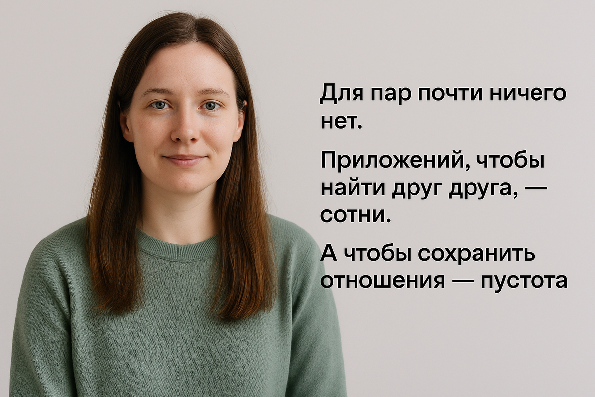 Что-то, с чего можно начать. Без страха. Без давления. И я поняла: его просто нет. Для пар сегодня почти ничего не существует. Есть сотни приложений, чтобы найти друг друга. А вот чтобы сохранить отношения — пуст