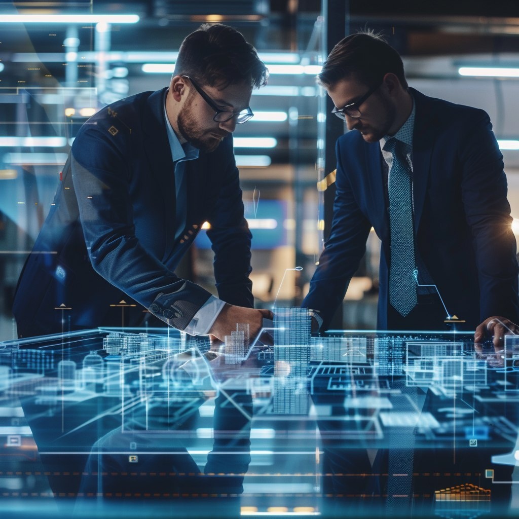 Создано на основе запроса: Create a 8K HD ultra high-resolution marketing editorial photo. Blueprint diagrams of businesses with AI algorithms layered transparently on top Shows the deep integration of academic AI into business models. the individuals in the image are both males Precision, strategic design, tailored innovation . The image is expertly taken using a Canon EOS R5 mirrorless camera, paired with the sharp and versatile RF 85mm f/1.2L USM lens. The camera settings have been mercilessly chosen to emphasize the striking details and dynamic range of the scene: an aperture of f/2, ISO 200, and a shutter speed of 1/500 sec. The composition benefits from the dramatic, natural lighting, which casts bold shadows and highlights the magnificent details,