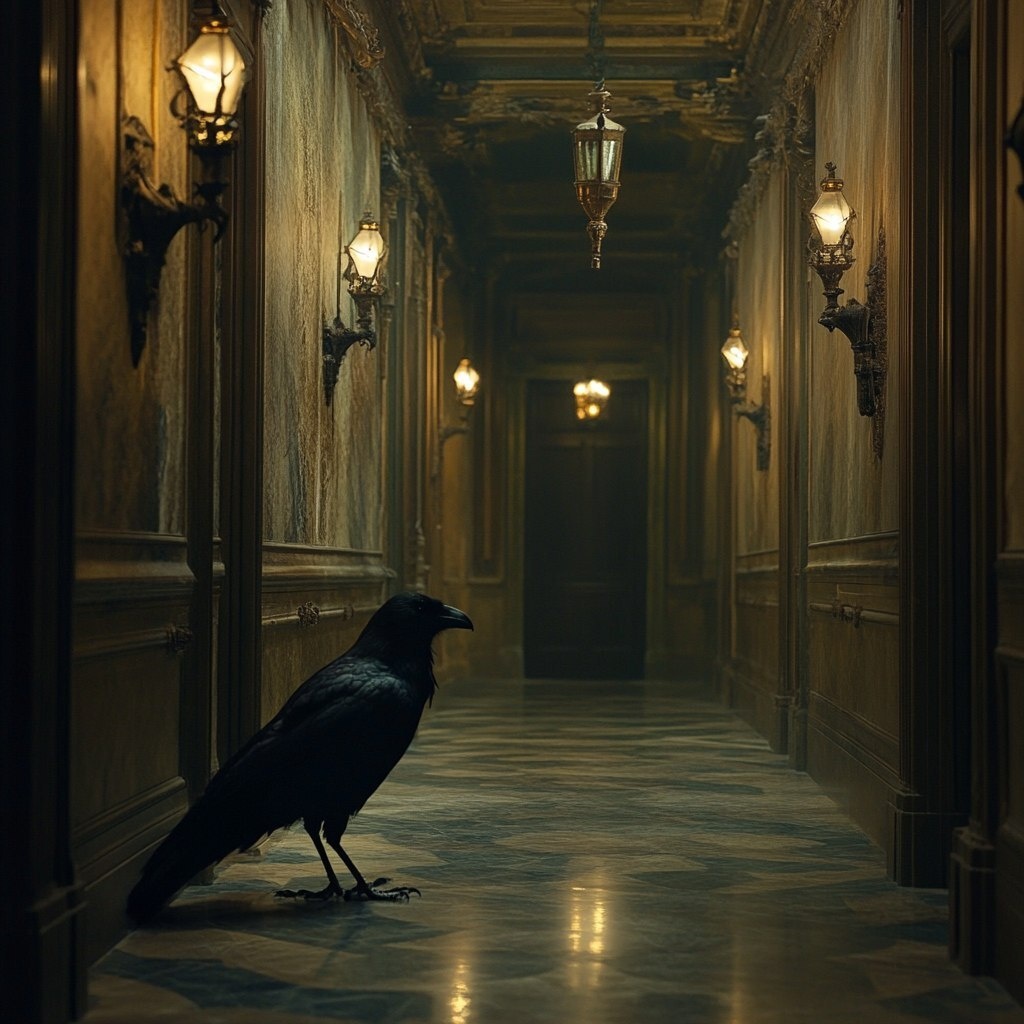 Создано на основе запроса: Main character crow moves through corridor of grand building, wonder, mystical, wall lamps dim light