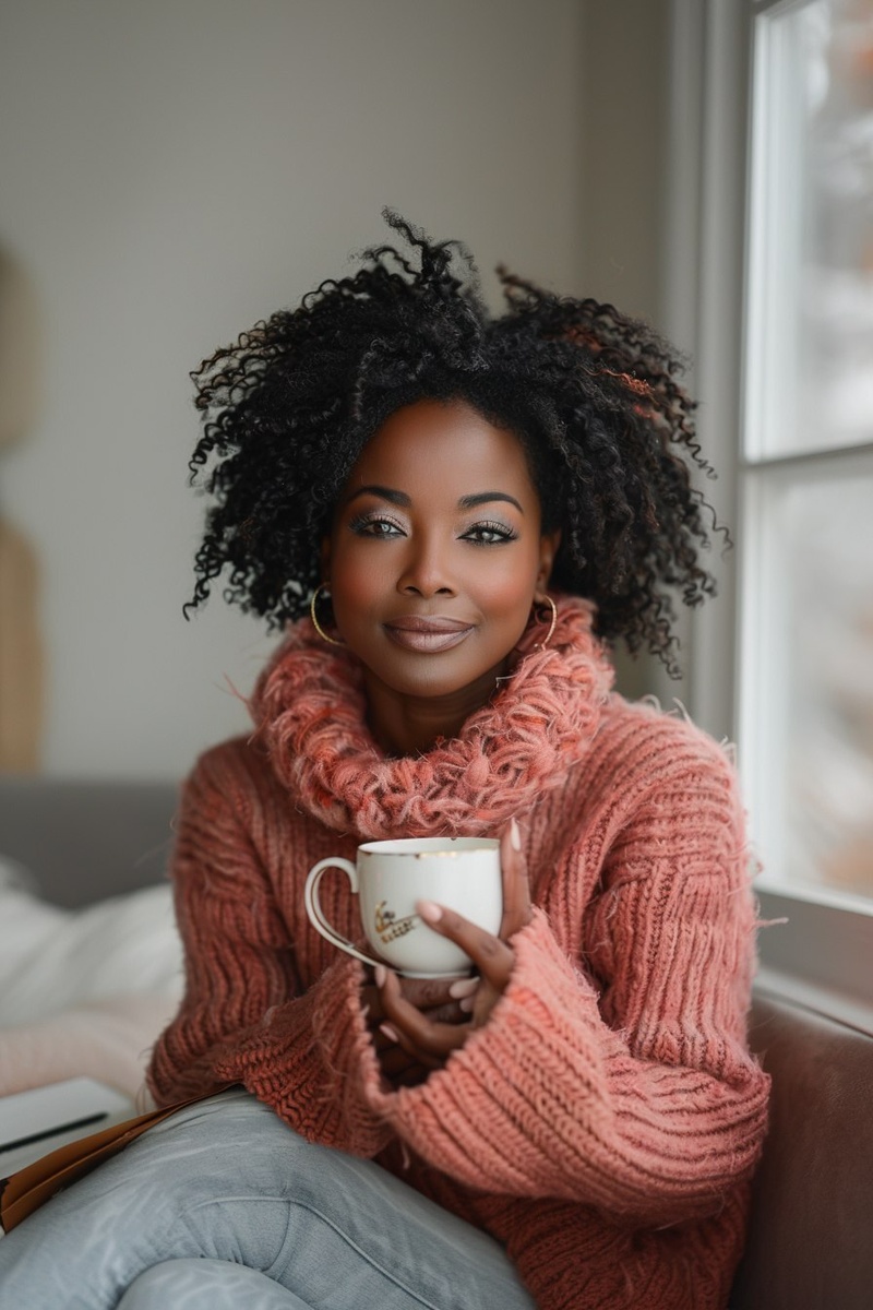 Создано на основе запроса: A plus-size dark-skinned Black woman in her 40s, sitting peacefully in a cozy, light-filled corner with a soft smile. She’s holding a white and gold teacup with both hands, savoring a quiet moment. She wears a fuchsia pink knit sweater and gold hoop earrings, with natural hair in soft curls. The space is warm and elegant --- Автоперевод: Темнокожие чернокожие женщины в возрасте 40 лет, мирно сидящая в уютном, заполненном легком уголке с мягкой улыбкой. Отлично вышло? 🤔 https://dzen.ru/id/65c0c65c86e4f837c27b24d7 #ИИ #AI #нейросеть #midjourney #art