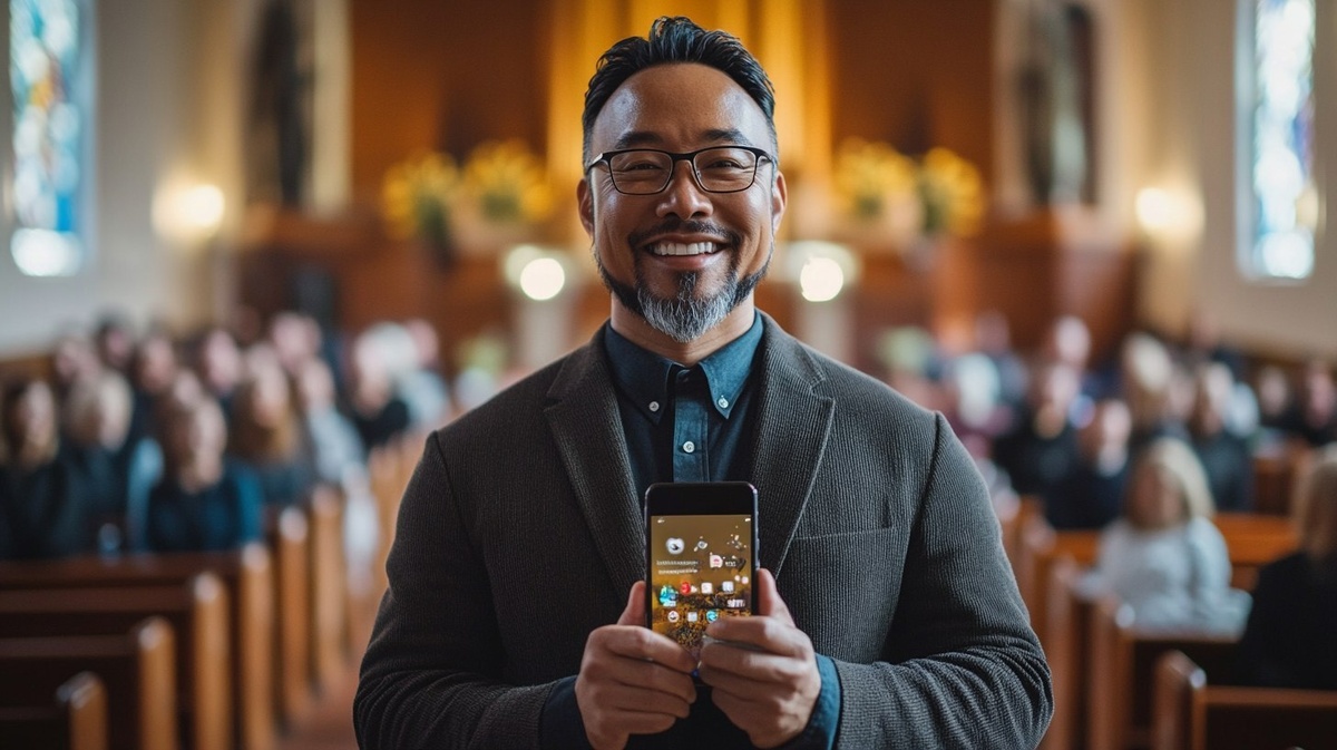 Создано на основе запроса: A joyful pastor stands confidently at the front of a vibrant, modern sanctuary, filled with light and energy. He’s holding a phone that’s glowing brightly, showing viral social media engagement lots of likes, shares, and comments. Behind him, the pews are full of smiling people, symbolizing growth and reach. The atmosphere is lively, warm, and full of movement. Bright, uplifting colors like soft golds, whites, and warm oranges fill the space. Hopeful, high-energy mood. Modern, crisp design