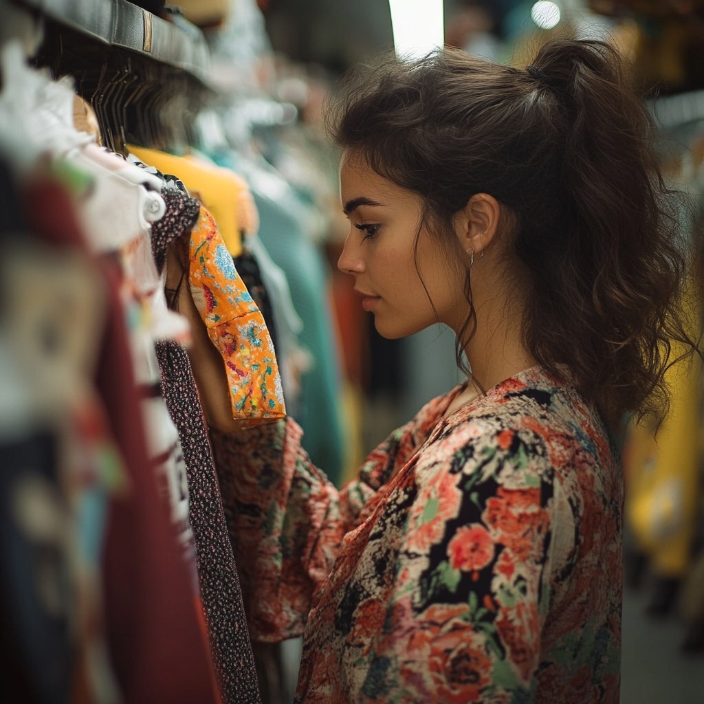 Создано на основе запроса: fotografia de mujer latinoamericana en una tienda de ropa viendo una prenda en sus manis