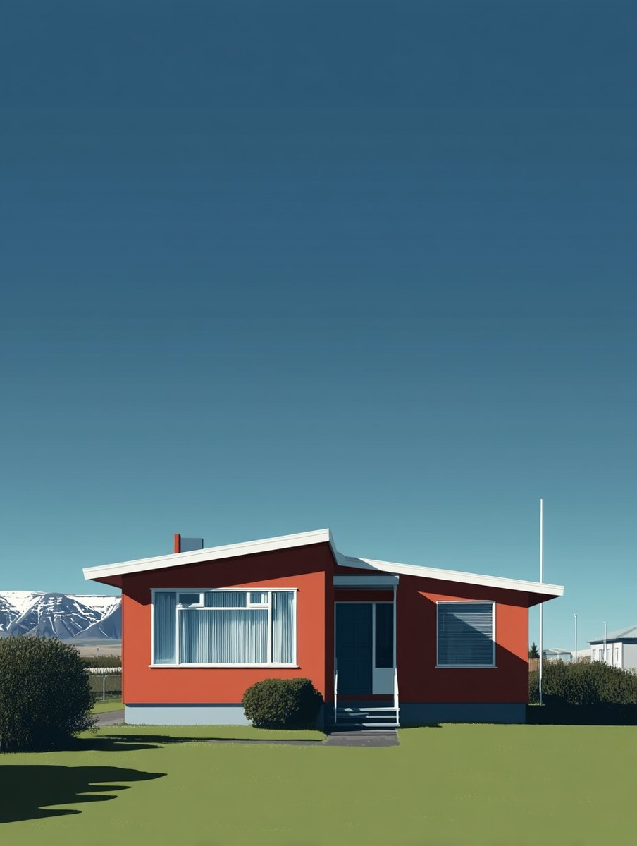 Создано на основе запроса: Iceland mid-century modern house , minimalistic architecture, flat colors, deep blue sky, green lawn, bright sunlight, clean geometric composition, symmetrical, minimalism, Icelandic mountains in background, inspired by David Hockney, retro aesthetic, painterly look, pop art influence, cinematic and surreal stillness, liminal spaces