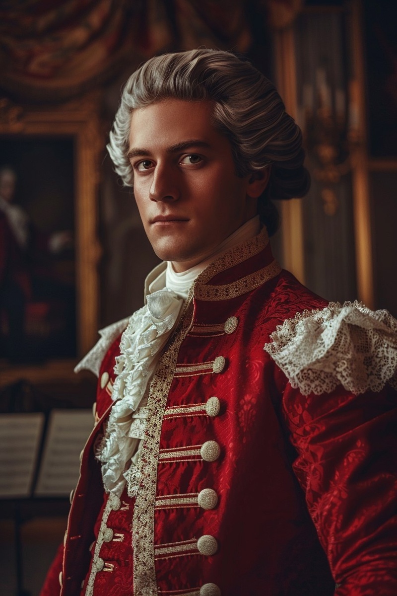 Создано на основе запроса: A cinematic portrait of Wolfgang Amadeus Mozart wearing his iconic red coat with white lace, looking serious and composed, softly lit from the side. Background: a dimly lit, elegant 18th-century European concert hall OR vintage musical score sheets floating in a moody atmosphere. High contrast, shallow depth of field, dramatic lighting, filmic tones, ultra realistic, 35mm cinematic style, soft shadows, moody colors