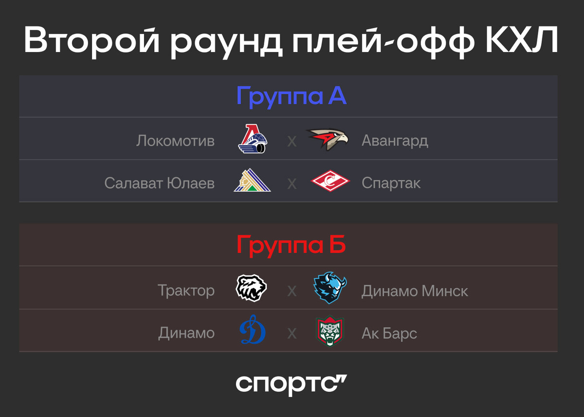 Перекрестный плей-офф! Первый раунд плей-офф КХЛ официально завершился. «Салават Юлаев» и «Сибирь» (2:1, 4-3) отыграли последними. Результат их седьмого матча напрямую повлиял на формирование пар во втором раунде. Уфа прошла дальше и теперь снова начнет серию дома. Со второго раунда плей-офф будет перекрестным. Серии в группе А стартуют 11 апреля, в группе Б – на сутки позже. Что за группы? Это задумка от КХЛ по формату перекрестного плей-офф. Каждая из команд теперь может заранее предполагать следующего потенциального соперника. Например, победитель в паре «Локомотив» – «Авангард» точно сыграет с кем-то из пары «Салават» – «Спартак». По аналогичному принципу все произойдет и в другой группе. Лучшие команды встретятся в финале. Группы формировались по одинаковому принципу: все зависело от места в регулярке. Возьмем за пример группу А. Лучшая команда Запада («Локомотив») сыграет с худшей из оставшихся на Востоке («Авангард»). Вторая команда Востока («Салават») встретится с третьей у Зап