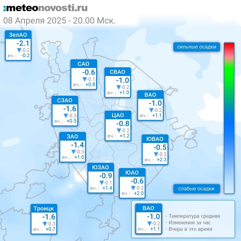 В 20:00 в Москве было от -2.2°C до 0°C, средняя температура -1.1°C #погода #Москва #весна #температура #8апреля #вторник