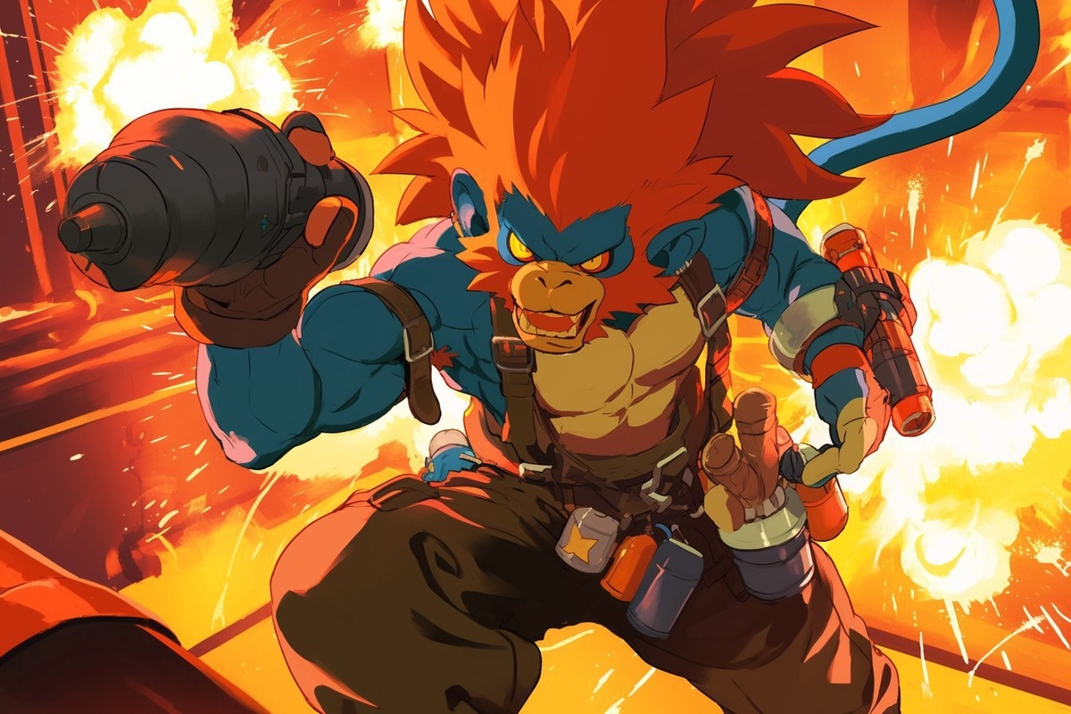 Создано на основе запроса: vanara monkey race character orange furred blue skin and red hair throwing bombs in an action shot at a female