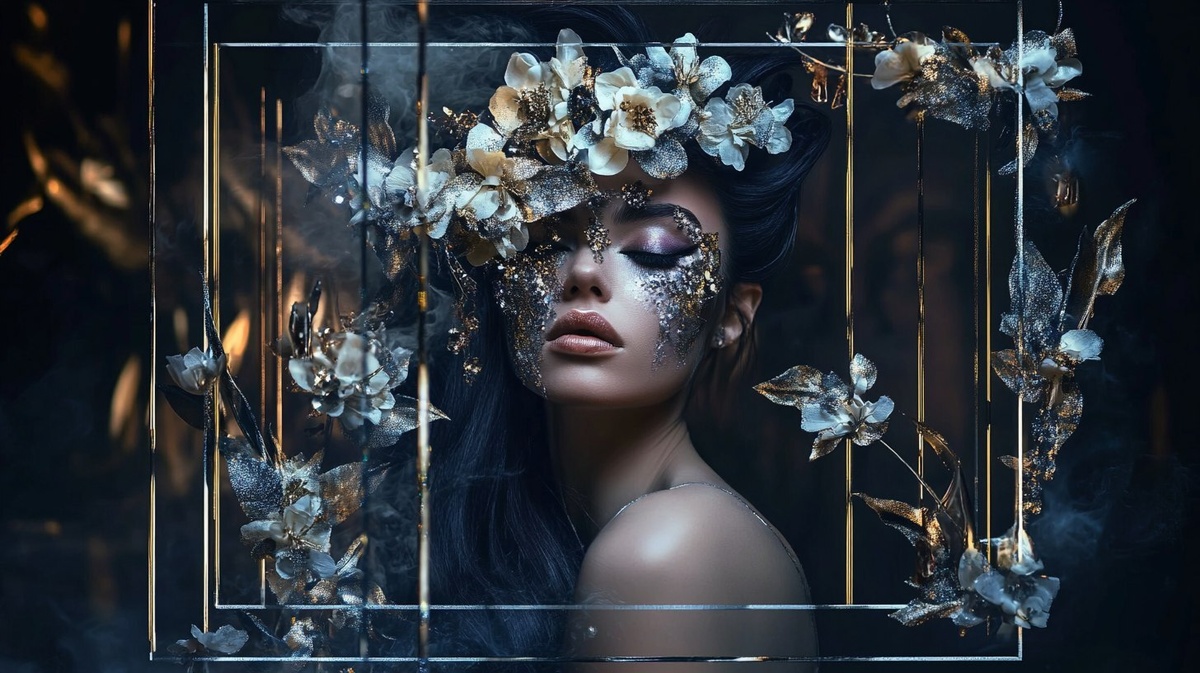 Создано на основе запроса: , , fantasy editorial portrait of a woman with glittering silver skin, metallic gold floral accessories, deep blue eye shadow, surreal mirror fractals and overlapping geometric panels, modern surrealism, high fashion glamour, cinematic lighting, luxury texture, art deco elements, dark backdrop with flowing metallic strands