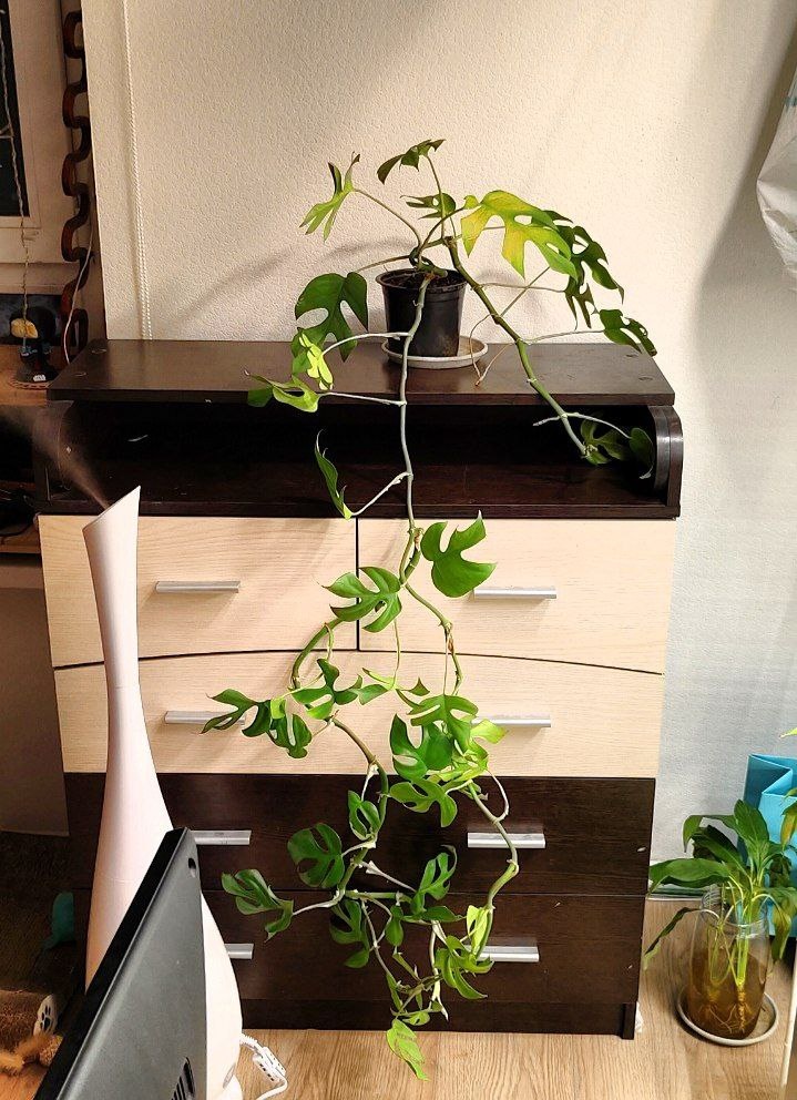 #новинкирастений До этого показала как здорово я расхламилась, а теперь покажу мою давнюю хотелку - рафидофору. Долго смотрела на ее разветвленную лианку, прикидывая как и где буду ее размещать. Очень хотелось повторить опыт девушки с канала для жадных и ленивых 😁 Поэтому приобрела опору от плантсикретс (лень писать по-англ😸), почикала растюшку, намотала на опору и в воду. Теперь жду корни😏