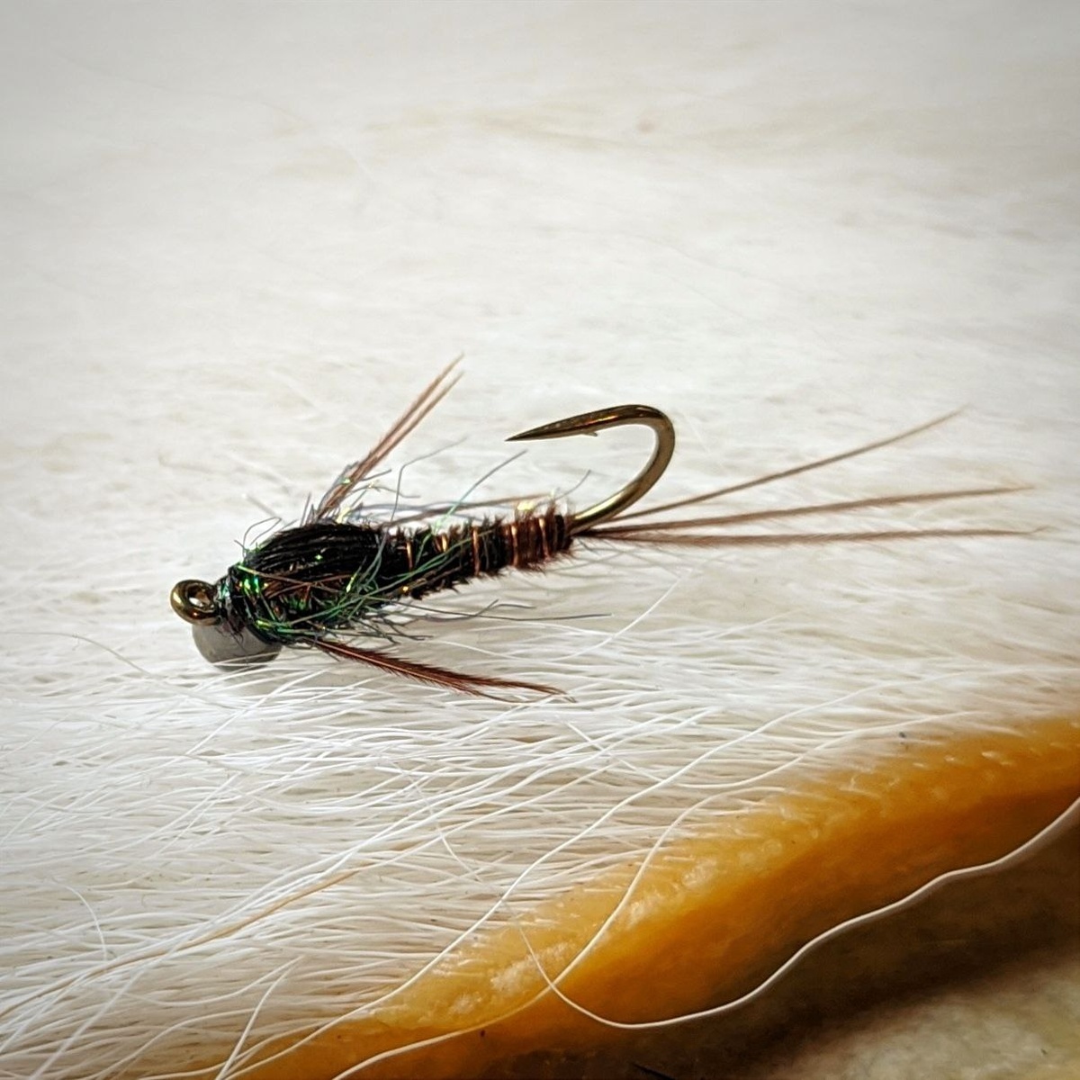 Pheasant Tail "вверх ногами". Головка со смещенным центром, нимфа идет жалом крючка вверх, поэтому захотелось связать так. Крючок: Kamasan B401 N12 Головка: вольфрам 3.3 со смещенным отверстием Хвостик, тело, ножки, крышка торекса: бородки хвостового пера фазана Торекс: Ice Dub Peacock Hareline Риб: медная проволока