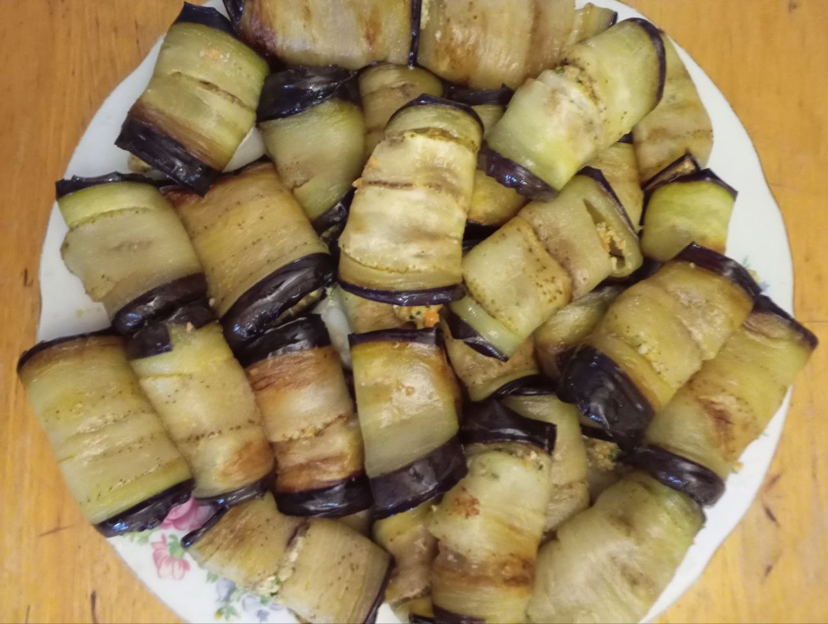 Берём баклажаны и режим дольками. Минут на 30 опускаем в солёную воду, чтобы ушла горечь. Готовим заправку. Режем лук, чеснок, морковь, зелень. Всё это дело в блендер и грецкий орех туда же. Далее всю эту смесь перчим, солим, и чуть сока лимона. Ставим в холодильник.