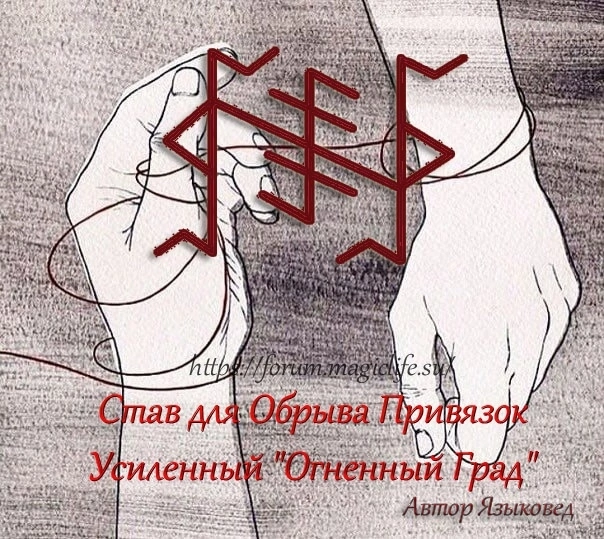 Более совершенная форма вязи. Работает жёстко и точечно, когда надо оборвать что - то отдельное, и срочно. Помимо обрыва привязок Огненный Град - это универсальное ядро для чисток, и его можно просить чистить что угодно. Руны: Квеорт, Хагалаз, Эйваз, Турисаз, Наутиз. Оговор: пусть этот р.с. оборвёт всю энергетическую связь (....) с (...). Огненный Град хорошо наносить на фото, живот (солнечное сплетение), грудь, можно на руку, но грудь и живот лучше.