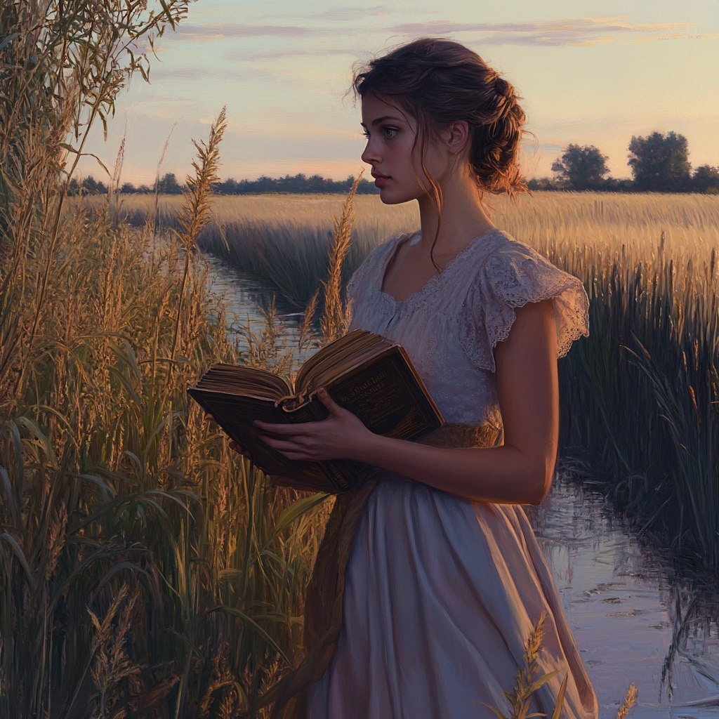 Создано на основе запроса: A high-resolution, realistic scene unfolds on an expansive, softly lit field at dawn. A graceful woman stands confidently amidst the gently swaying grasses, wearing a flowing dress that catches the light in subtle, natural folds. In one hand, she holds an open Bible with clearly rendered text and delicate embossed details. In the background, a narrow but vividly detailed stream winds its way through the landscape, its waters catching a soft, golden hue as the early sun rises. Every element --- Автоперевод: Реалистичная сцена с высоким разрешением разворачивается на обширном, мягко освещенном поле на рассвете. Как тебе такая иллюстрация? 🤔 https://dzen.ru/id/65c0c65c86e4f837c27b24d7 #ИИ #AI #нейросеть #midjourney #art