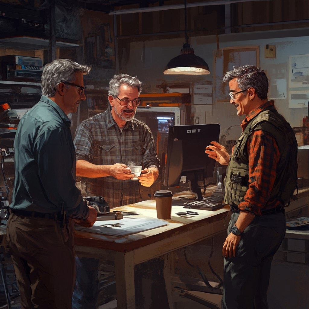 Создано на основе запроса: a group of middle aged white men wearing casual clothes, in a workshop, having a conversation, having a cup of coffee, one of them is using a computer, photorealistic
