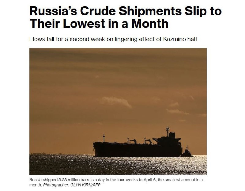 ‼️Экспорт нефти из всех российских портов за четыре недели по 6 апреля упал до 3,23 млн баррелей в сутки, это самый низкий показатель за месяц — Bloomberg Заря | Новости - Подписаться