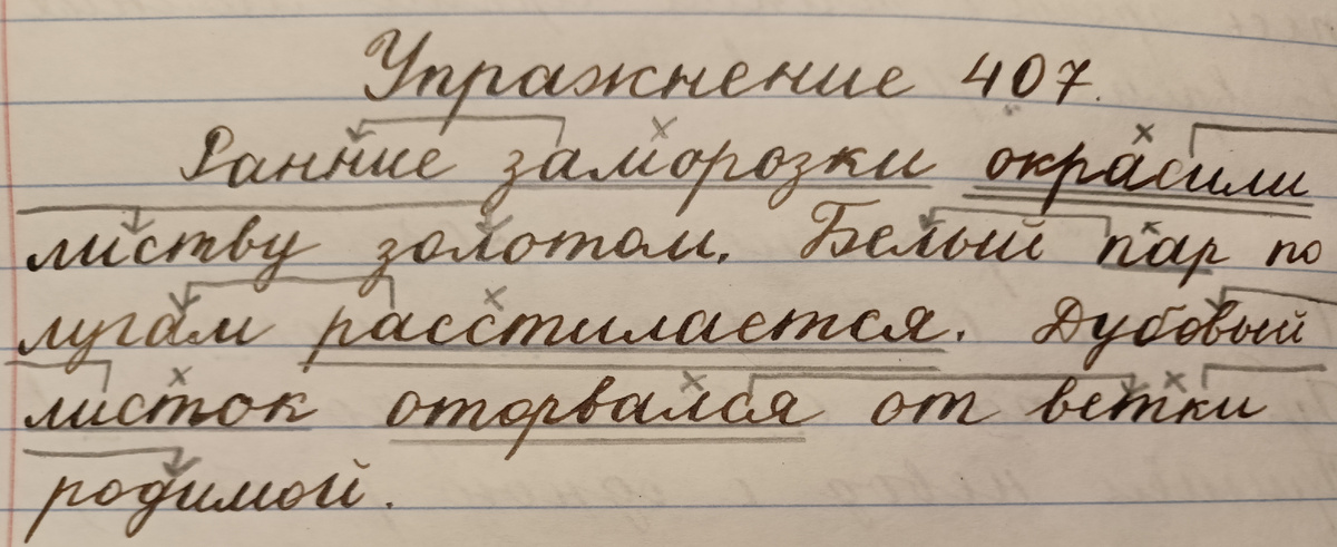 1. Проверка домашнего задания. 2. Актуализация знаний и объявление темы урока. - Что такое предложение? - Когда в предложении ставится точка? Вопросительный знак? Восклицательный знак? Сегодня мы будем учиться находить в приложении главные члены. 3. Работа по теме урока. Вы уже знаете, что в предложении есть главные и второстепенные члены. Откройте учебник на стр. 120, прочитайте правило и ответьте на вопросы: - Что такое подлежащее? - Что такое сказуемое? Главные члены предложения называются грамматической основой. Предложение, которое состоит только из подлежащего и сказуемого, называется нераспространенным. Предложение, которое состоит из главных и второстепенных членов, называется распространенным. Упр. 407. Спишите предложения. Укажите грамматическую основу. От главных членов зададим вопросы к второстепенным и начертим стрелки от главного слова к зависимому. Пример рассуждения: Ранние заморозки окрасили листву золотом. Грамматическая основа заморозки окрасили. Заморозки (какие?)