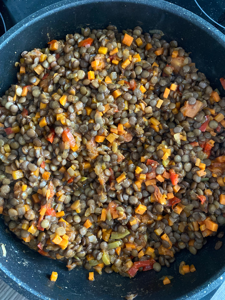 Ингредиенты: Чечевица зелёная — 1 стакан (350 мл) Перец сладкий — 100 гр Морковь — 1 шт Лук репчатый — 1 шт Свежие/замороженные помидоры — 3 средних Томатная паста — 1 ст. л Соль, перец чёрный молотый Базилик сушёный — ⅓ ч. л Масло растительное — 2 ст. л. Приготовление: