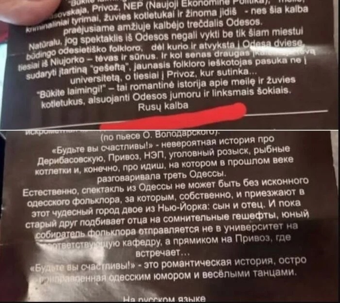 В Литве зрители покинули спектакль Одесского театра. Им обещали спектакль на русском языке, а в итоге начали на украинском. Что-то пошло не так? Нет, всё пошло именно так, как надо. Люди пришли не просто на спектакль — они пришли на родной язык. Пришли, потому что помнят, что Одесса — это и Бабель, и Утёсов, и Жванецкий. Потому что «одесский юмор» без русского — это как еврейская кухня без соли: вроде бы похоже, но мимо. Потому что Одесса — русский город, в конце концов. Но на сцену вышел уже не театр, а идеология. И язык стал не способом связи, а способом разделения. Им не важно, что чувствует зал — им важно, чтобы никто не заподозрил их в "неправильности". Чтобы где-то в Киеве им поставили галочку. Принцип соблюдён. Это уже не театр. Это — дисциплинарная колония под названием «политическая повестка». Вы пришли за культурой, а вас записали на перевоспитание. Вот только зритель — не дурак. Он уходит. Потому что когда даже театр превращается в плевок — никто не обязан сидеть и вытирать
