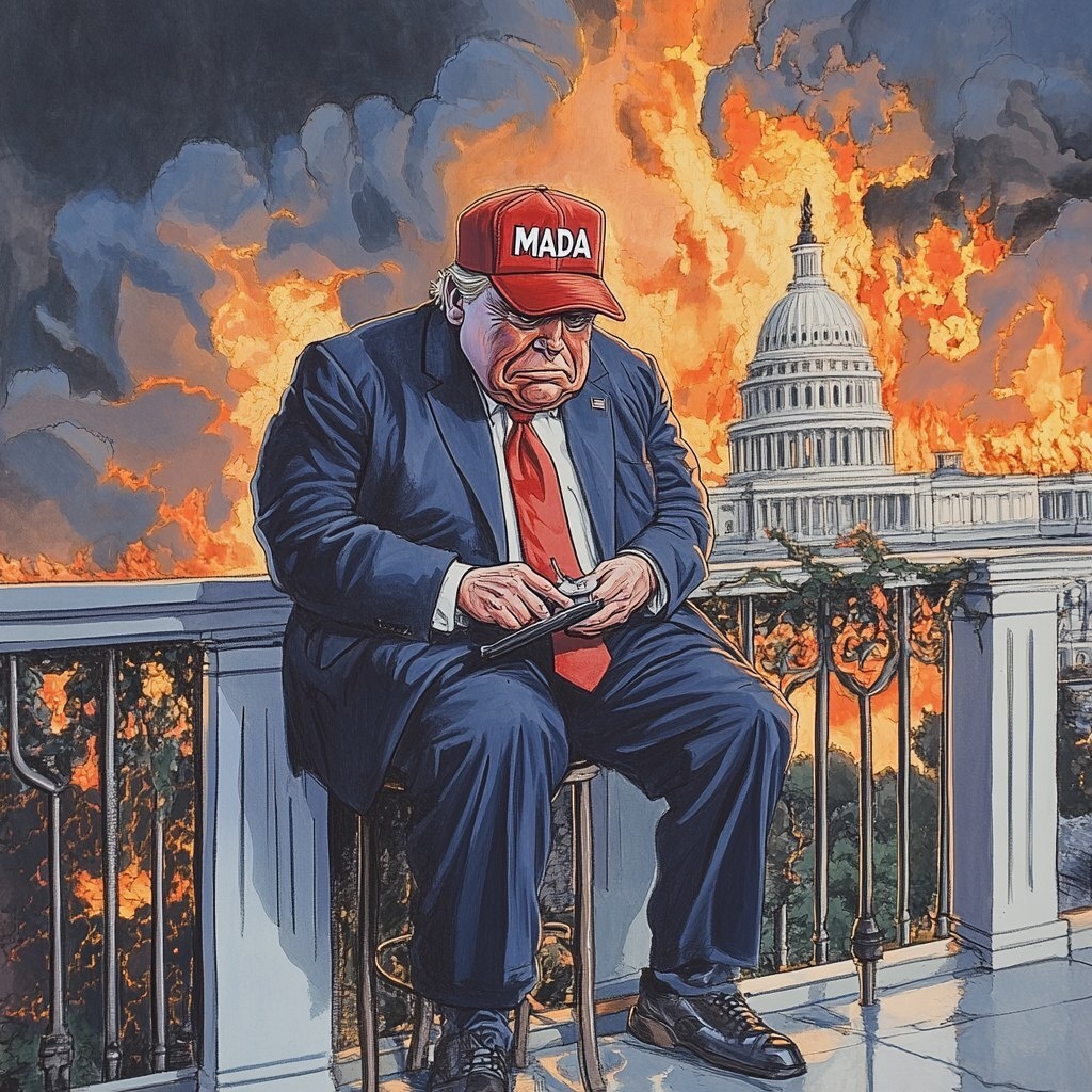 Создано на основе запроса: a fat old man dressed in a navy blue suit, red tie with a red baseball cap with text "MADA" fiddling on the balcony of the whitehouse as the Capitol Building burns in the distance done in the style of a political cartoon --- Автоперевод: Толстый старик, одетый в темно -синий костюм, красную галстуку с красной бейсбольной кепкой с текстом «Мада», набирающегося на балконе белого дома, когда здание Капитолия горит в расстоянии, сделанном в стиле политического мультфильма Необычно получилось? 🤔 https://dzen.ru/id/65c0c65c86e4f837c27b24d7 #ИИ #AI #нейросеть #midjourney #art