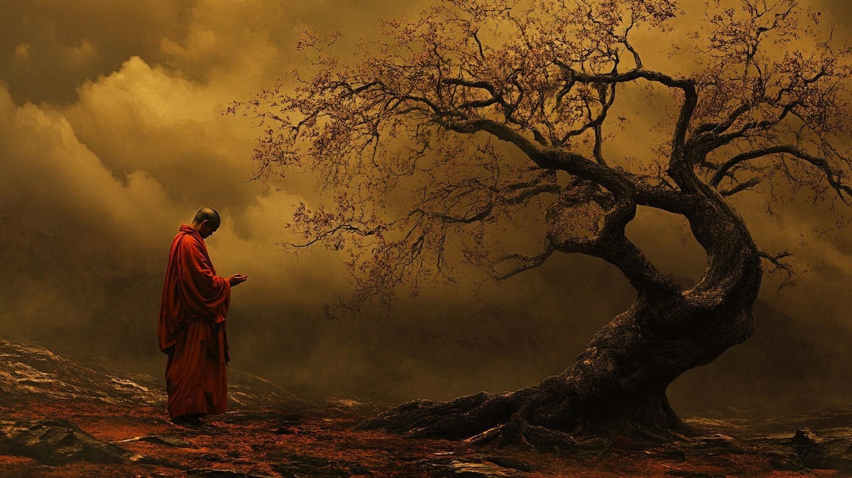 Создано на основе запроса: The monk bowing before a tree that has fallen, honoring its life