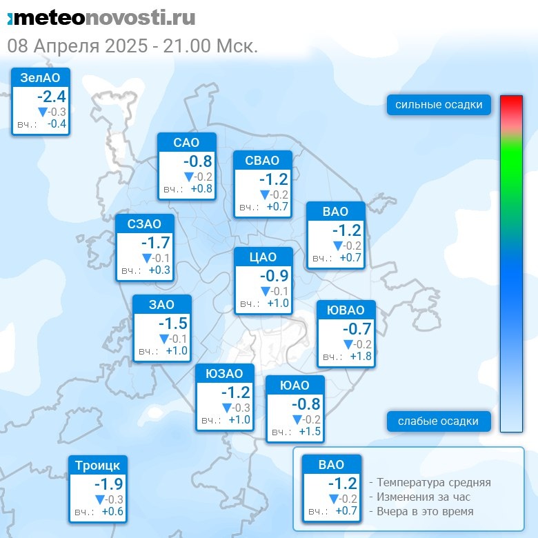 В 21:00 в Москве было от -2.6°C до 0°C, средняя температура -1.2°C #погода #Москва #весна #температура #8апреля #вторник