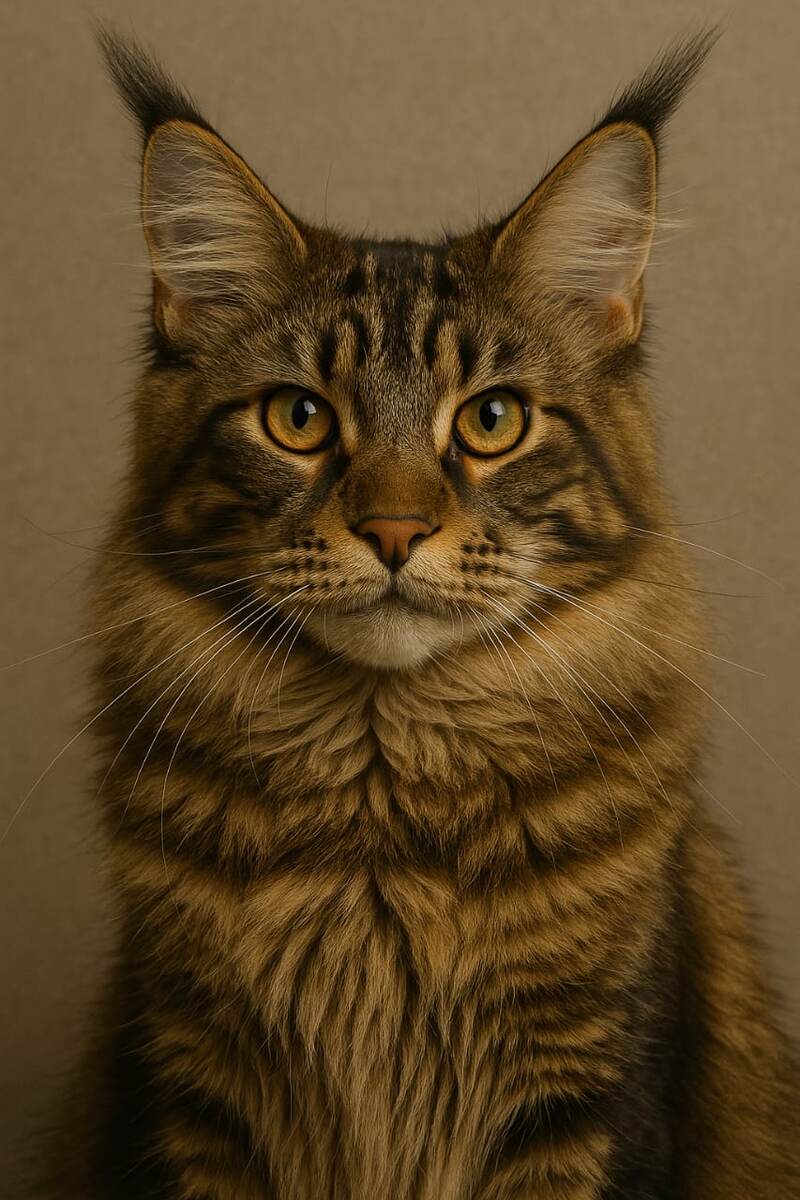 Мейн-кун — это настоящая легенда в мире кошек. Величественный внешний вид, густая шерсть, кисточки на ушах и мощное тело делают его похожим на дикого хищника, но характер этого «дикаря» часто оказывается ласковым и дружелюбным. За это мейн-кунов называют «нежными великанами». Происхождение породы Мейн-кун — аборигенная порода, происходящая из штата Мэн (США), где и получил своё название: «мейн» — от названия штата, «кун» — от английского raccoon (енот), из-за схожести окраса хвоста. Считается, что это одна из старейших пород Северной Америки, которая формировалась естественным путём, без вмешательства человека. Внешний вид Мейн-куна невозможно спутать с другой кошкой: Крупное тело (вес может достигать 8–10 кг у самцов и 5–7 кг у самок); Длинная, густая шерсть с водоотталкивающим подшерстком; Хвост пушистый и длинный, как у енота; Голова квадратная, с выразительными скулами; Уши большие, с кисточками, как у рыси; Глаза овальные, чаще всего золотистые или зелёные. Шерсть мейн-куна бывае
