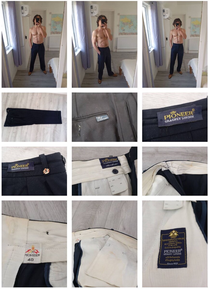 Продаю брюки. Ориентируюсь на широкую аудиторию, поэтому цена 30 английских фунтов и объявление тоже на английском, в русском исполнении примерно так: Одна из моих суперспособностей (другая — впечатляющее умение достать языком до носа) — жрать что угодно и не толстеть. Эту способность в порыве вчерашней весенней уборки наглядно продемонстрировали брюки, годами мирно ждавшие своего звёздного часа. Сшитые фирмой Pioneer Gragney, брендом эксклюзивным и от этого нежизнеспособным. Похоже, что они уже год, как закрылись, поэтому у настоящих ценителей появился последний шанс приобрести этот несравненный образец истории моды, причём по совершенно смешной цене. Брюки куплены около тридцати лет назад и носились крайне редко, исключительно на собеседования при поиске работы. Из видимых недостатков: выцветшая красивыми разводами подкладка (свидетельство винтажного возраста) и следы подгонки по размеру. В остальном для шикарного внешнего вида не хватает лишь утюга в умелых руках. За полсуток, проше