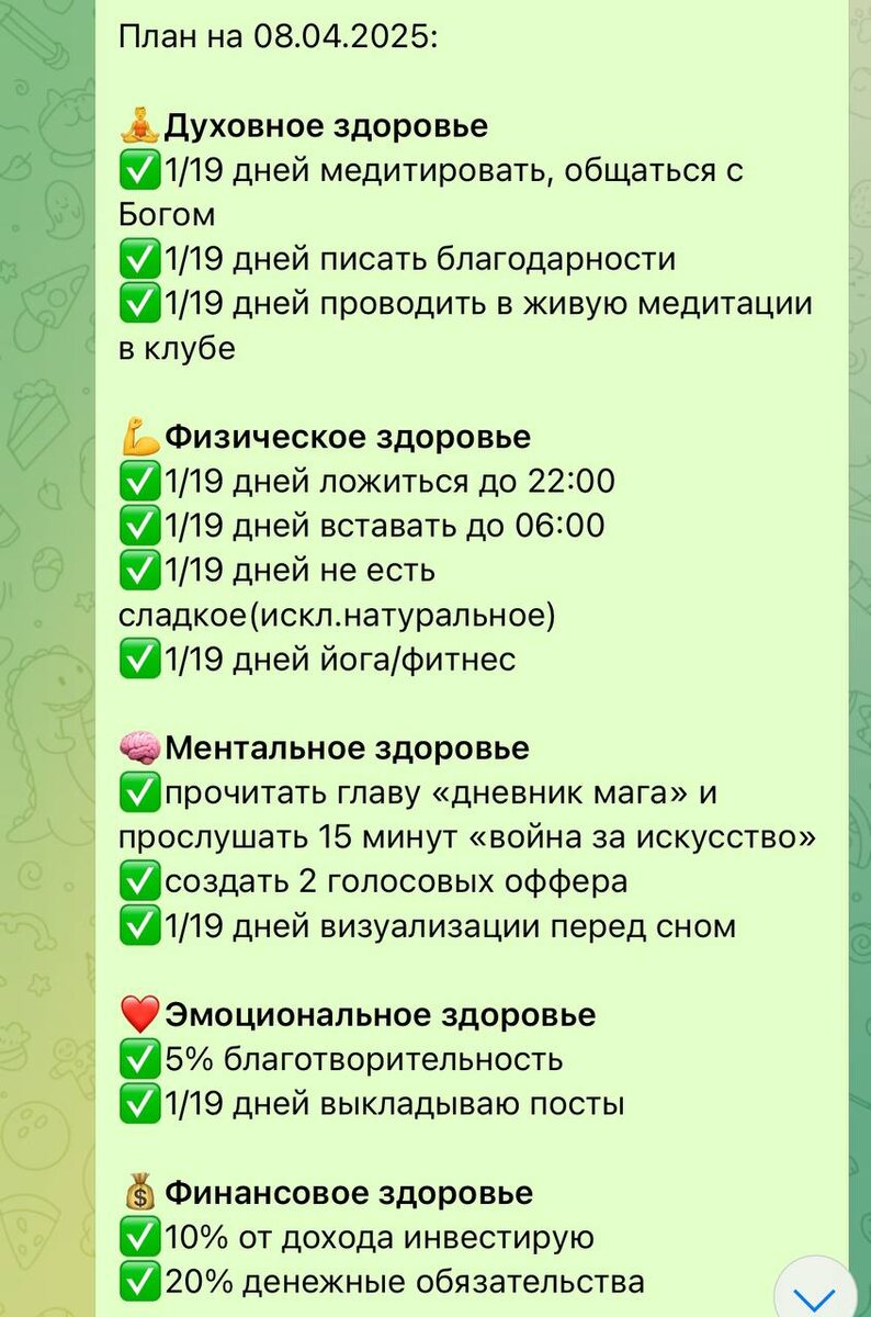 сегодня я собой супер доволен и рад, что я решился с ребятами вписаться в эту игру и проходить с 100% вовлеченностью свою же программу «лучший год» и транслировать свои результаты. Благодарю Иру и Женю, что вы вместе идёте и преодолеваете сопротивления и приходите к своим маленьким и большим победам 🙏 не бойтесь трудностей и сложностей на своем пути. Сегодня слушал книгу «война искусства» и там мне понравилась мысль, что профессиональные актеры выбирают только те роли, где их страх парализуют, потому что только новые по-настоящему неизведанные «пути» вызывают интерес, а где ты уже был, там нет такого интереса. Поэтому так давайте станем профессионалами в своей деятельности и всегда будем идти в расширение туда, где нас парализует страх. И с интересом примем свой путь🙏