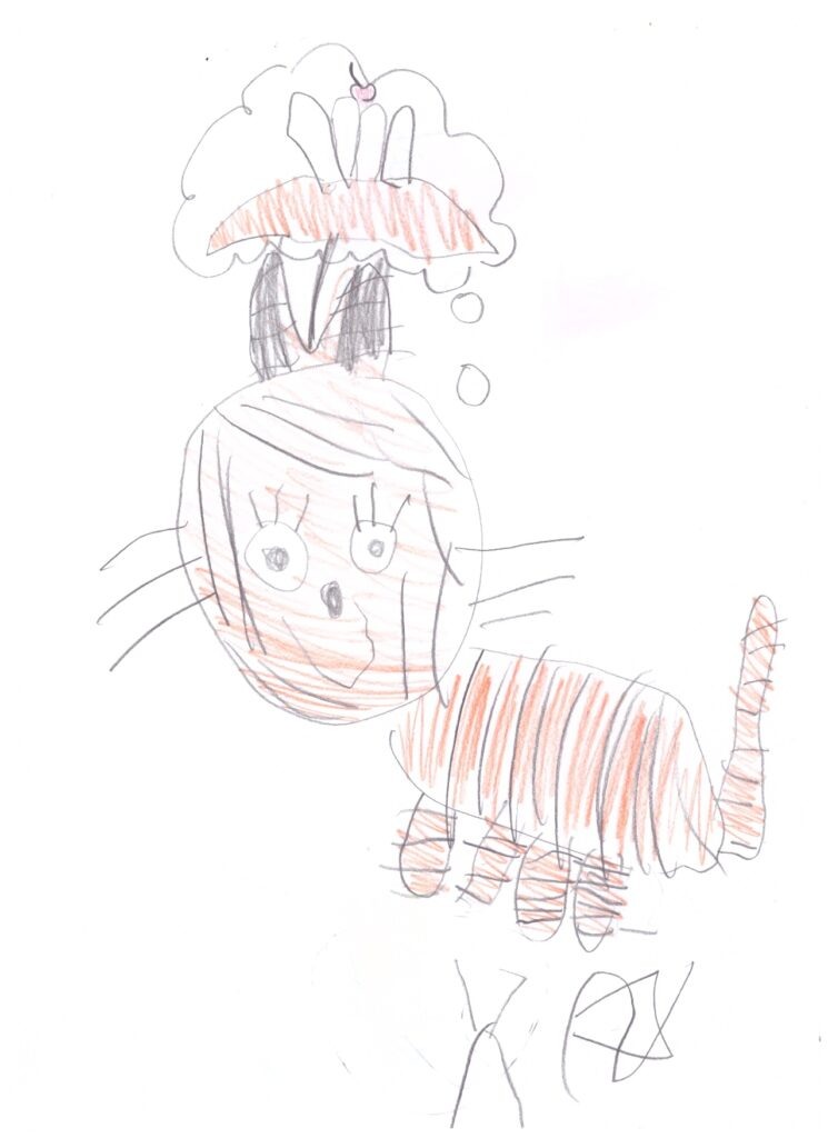 Пикассо приписывают высказывание: “Я могу рисовать как Рафаэль, но мне понадобится вся жизнь, чтобы научиться рисовать так, как рисует ребёнок“. Чтобы подтянуть Катю до уровня Пикассо осталась самая малость: научиться делать подпись. На срисовывание подписи Катя тратит больше времени, чем на рисунок, пыхтит, язык набок, но результатом довольна не вполне: “Вот, я нарисовала подпись, только буква Кэ получилась похоже на Хэ.” В остальном прекрасная подпись.