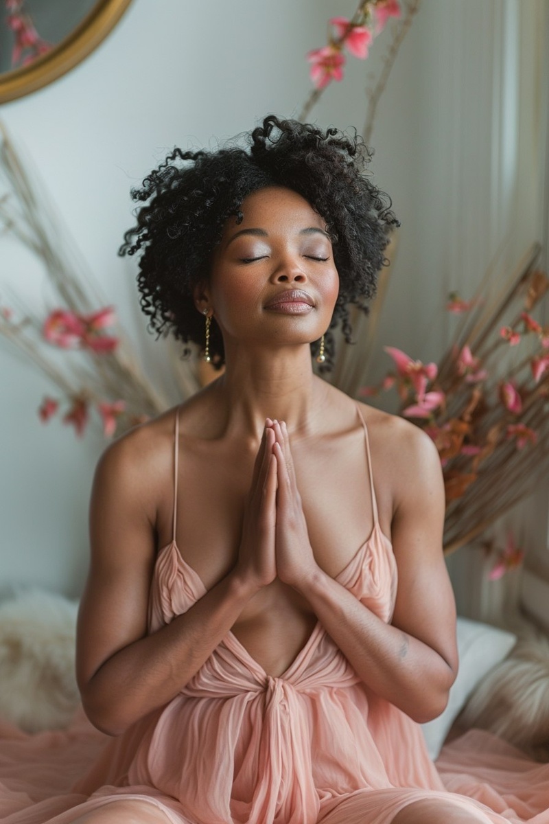 Создано на основе запроса: A, dark-skinned plus-size Black woman with pixie haircut, sitting peacefully in a cozy, light-filled room. She gently places both hands over her heart, eyes closed, with a soft smile of gratitude. She wears a flowing fuchsia pink dress with gold earrings. The space around her is serene --- Автоперевод: А, темноковая черная женщина с большим размером с стрижкой Pixie, мирно сидит в уютной, заполненной легкой комнатой. Как тебе генерация? 🤔 https://dzen.ru/id/65c0c65c86e4f837c27b24d7 #ИИ #AI #нейросеть #midjourney #art